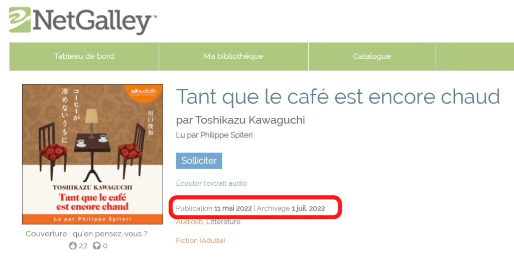 - Vérifiez toujours la date de publication – pour savoir quand le livre paraîtra – et d’archivage – pour savoir quand le livre ne sera plus disponible à lire ni à télécharger sur NetGalley. (Vous pouvez trouver ces dates sur la fiche du titre) Nous vous recommandons toujours de télécharger votre livre une fois qu’il vous a été validé, car une fois un livre archivé, il n’est plus possible de le télécharger.