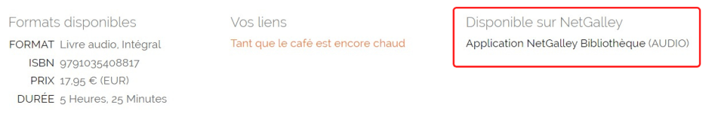 - Vérifiez aussi les formats de lecture qui sont disponibles. En bas de la fiche du titre vous pouvez voir si le titre est disponible en EPUB ou PDF, et les options de lecture proposées par l’éditeur. L’application NetGalley Bibliothèque est le moyen exclusif d’écouter les livres audio mis à disposition sur NetGalley, et le moyen recommandé pour accéder aux services de presse numériques. Il est aussi possible de les envoyer vers votre Kindle, ou de les télécharger en tant que PDF et EPUB protégé (cette dernière option de lecture est en particulier utilisée pour des livres illustrés qui ne sont pas bien adaptés au format Kindle). Retrouvez ici également toutes les informations sur les différents supports de lecture. Ces informations vous permettront de réfléchir si vous voulez vraiment solliciter un titre, en particulier si le format disponible ne vous convient pas.