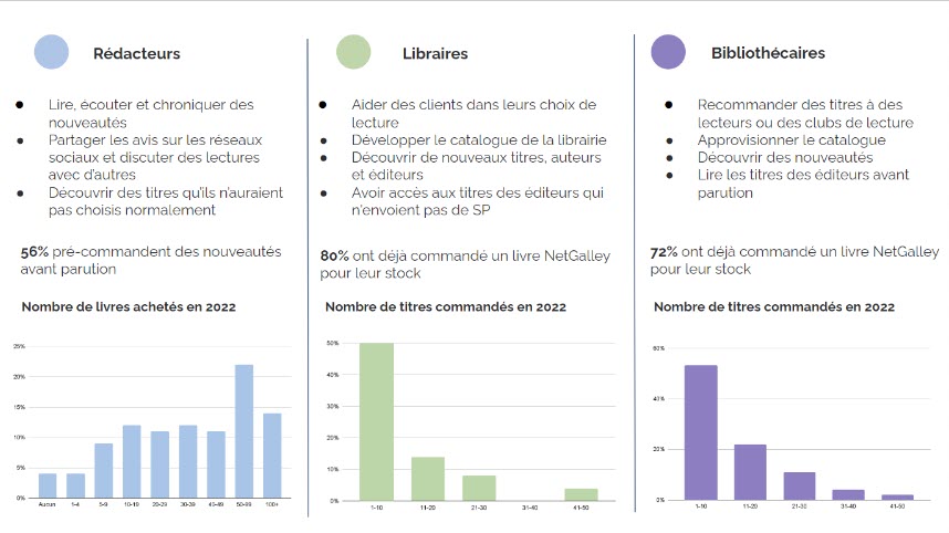 Le sondage prouve que NetGalley joue aujourd’hui un rôle important dans l’activité professionnelle des lecteurs : plus de 80% des libraires et plus de 72% des bibliothécaires participants ont déjà commandé un titre NetGalley pour leur stock. Et pour nos Rédacteurs – même en dehors de leur usage NetGalley, cela reste des grands lecteurs dont 22% ont acheté entre 50 et 99 livres en 2022.