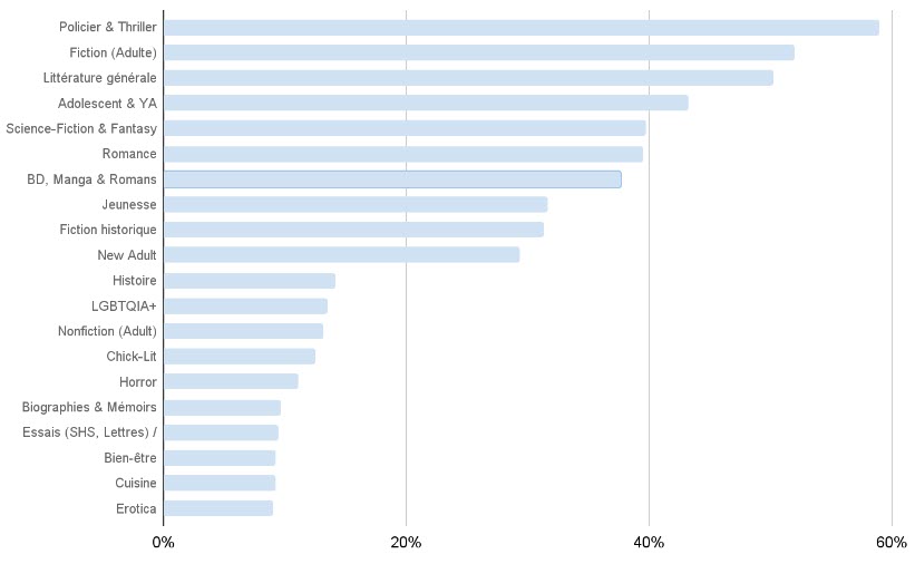 Pour connaître les habitudes des lecteurs, nous les avons également interrogés sur leurs genres préférés sur NetGalley. Bien que nous ne soyons pas surpris d’apprendre que le polar ou le Young Adult trouvent leur public sur NetGalley, cela était un plaisir de constater que la Non-fiction s’y trouve également représentée avec un taux de 13%.