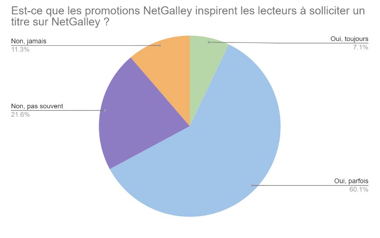 Nous nous sommes également intéressés à l’impact de nos Promotions NetGalley (newsletters à thème, carrousel NetGalley recommande, encarts sur le tableau de bord lecteur et mises en avant sur les réseaux sociaux) sur le choix de nos lecteurs à solliciter ou à télécharger un livre, et une grande majorité des réponses confirme un impact positif des promotions.