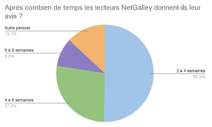 Une grande majorité des lecteurs transmettent leurs chroniques 2 à 4 semaines après la validation de leur demande et la réception du titre. 13% des lecteurs travaillent avec d’autres périodes – une partie indique envoyer leurs chroniques dès que la lecture est terminée, une autre n’a pas de programme fixe.