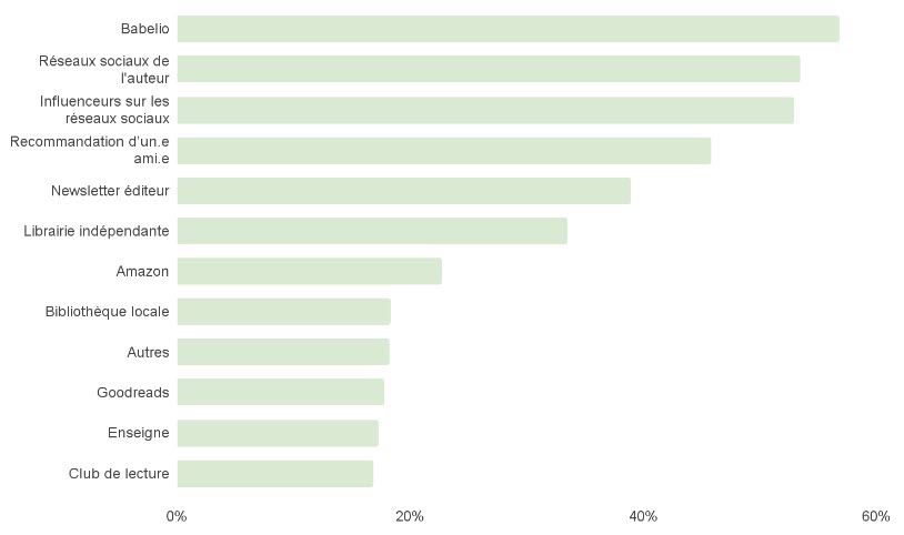 Tournons maintenant l’attention vers la découverte des nouveautés. Sachant que les lecteurs trouvent de l’inspiration à de nombreux endroits lorsqu’il s’agit de dénicher leur prochain coup de cœur, nous les avons interrogés sur leurs lieux de découverte en dehors de NetGalley. Ici, Babelio brille encore aux côtés des réseaux sociaux :