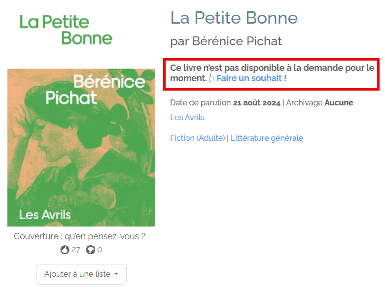 Vous pouvez aussi voir l’option Faire un souhait pour un livre, cela indique à l’éditeur que vous êtes intéressé.e d’y avoir accès.