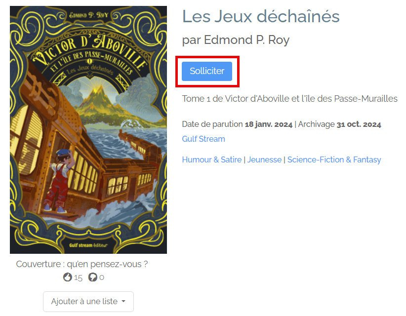 L’option Solliciter est la plus connue des lecteurs sur NetGalley. En un seul clic, les lecteurs peuvent solliciter les livres qu’ils souhaitent lire et chroniquer.
