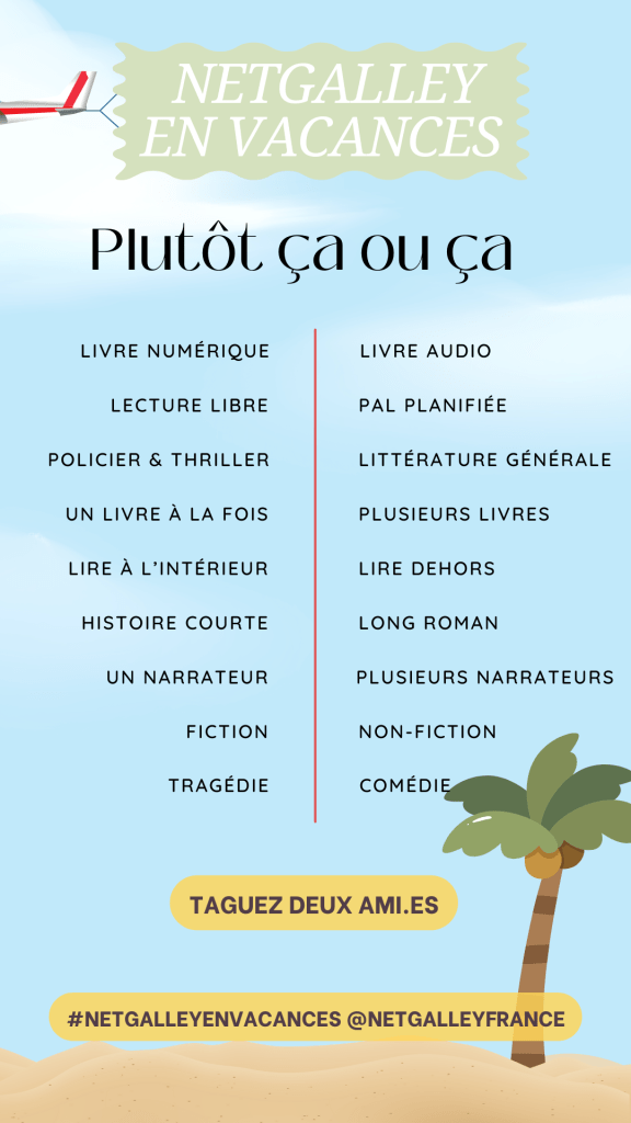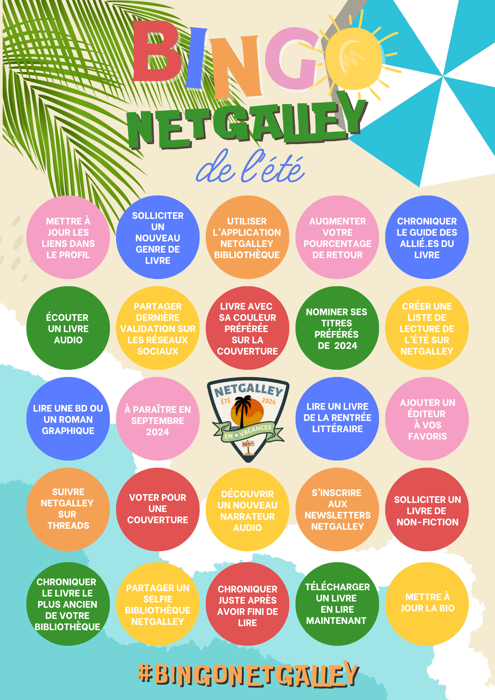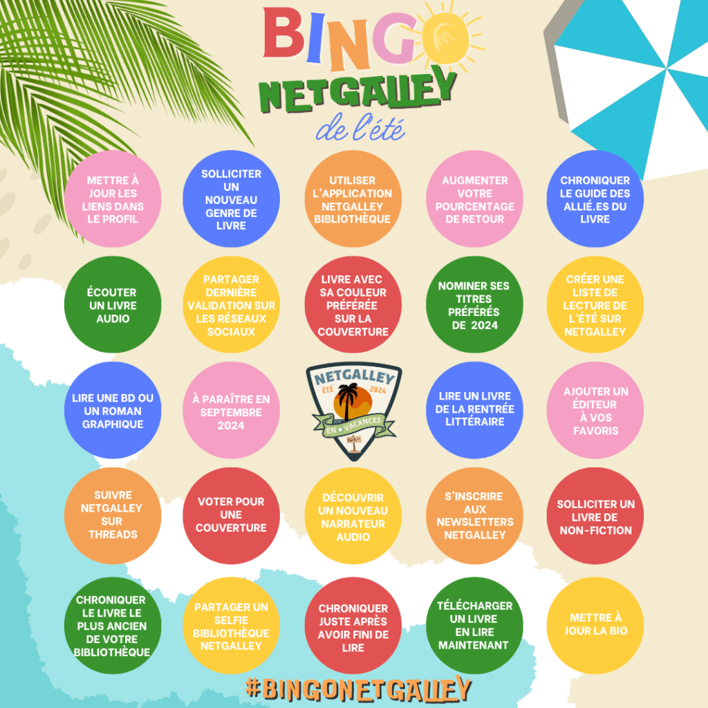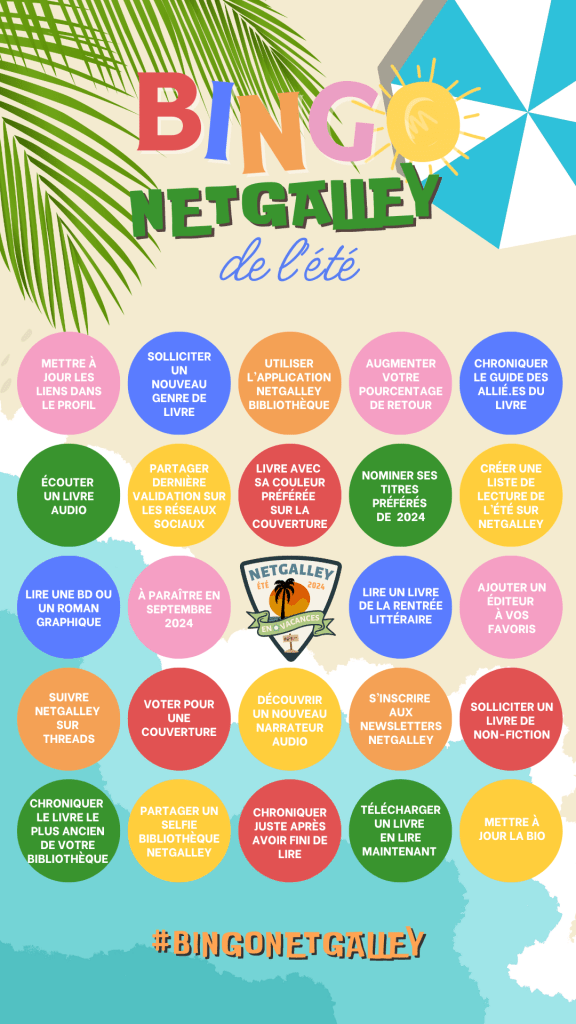 Taguez @netgalleyfrance et utilisez le #BingoNetGalley pour partager votre progression pendant tout l’été, et le #NetGalleyenVacances pour échanger avec d’autres lecteurs et lectrices !